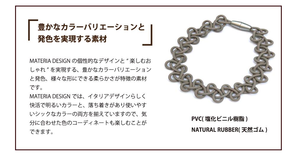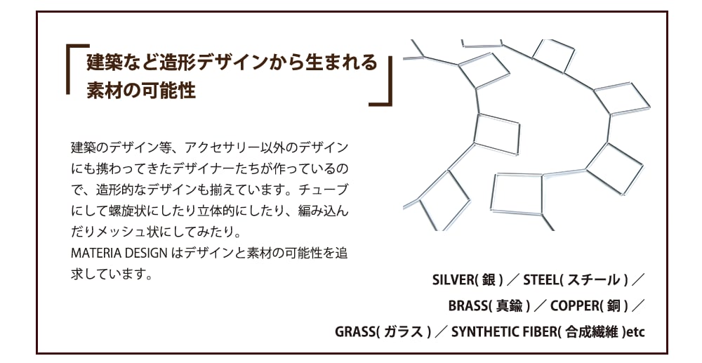 ブランドの特徴は素材への情熱とこだわり。デザイナーが興味深い素材を発掘し、その素材の特徴をより美しく、より使いやすくなるようにデザインします。レザー・スチール・銅・ナイロンなどアクセサリーには珍しい素材で作られたMatericでEmotionalなアクセサリーは、コーディネートする人のイマジネーション次第で幾通りものスタイルを生み出します。