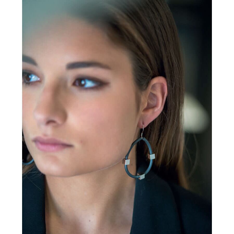 カラーチューブフープにメタリックなビーズを配したピアス。
