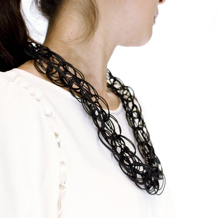 細い樹脂紐を2本取りで立体的に緩く編んだアート感覚あふれるネックレス。